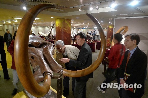 由澳门中华文化艺术协会和广东中华民族文化促进会主办的《唤醒万年的沉睡——古象牙雕刻艺术藏品展》十二月十二日已完成布展,近百件猛犸象牙雕将于十四日起在澳门金璧文娱中心展出十天。图为一副完整的冰河时期猛犸象头骨化石和牙化石。中新社发 毕永光 摄