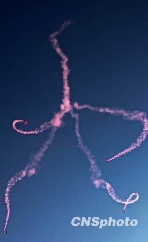 图为莲花盛开,运动员带着彩烟在空中形成一朵美丽的莲花。中新社发 谭超 摄