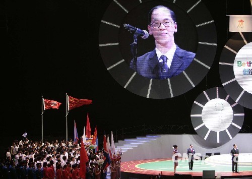 图为东亚运动会联会会旗降落。中新社发 张勤 摄