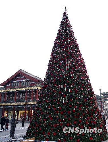 前门大街首次搭建“圣诞树”,为充满明清古韵的街道增添了一道独特的风景。中新社发 玉龙 摄
