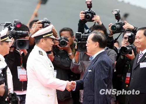特区行政长官曾荫权出席欢迎出席仪式,迎接护航编队指挥员王志国副司令员。中新社发 洪少葵 摄
