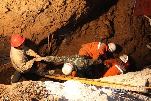 图:六盘水工地塌方 被埋民工获救(2)