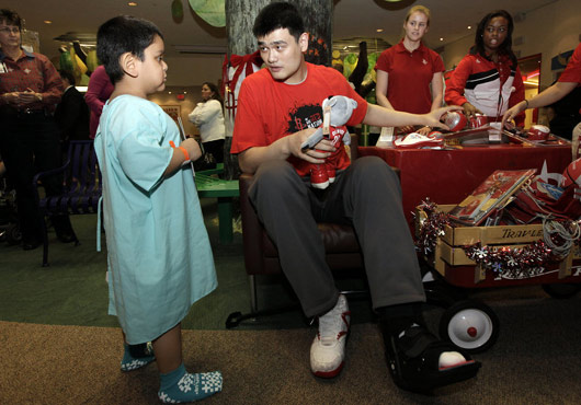 2009年12月14日,美国休斯敦,姚明和几位休斯敦火箭的队友来到一家儿童医院看望患儿,并为孩子们送去礼物。