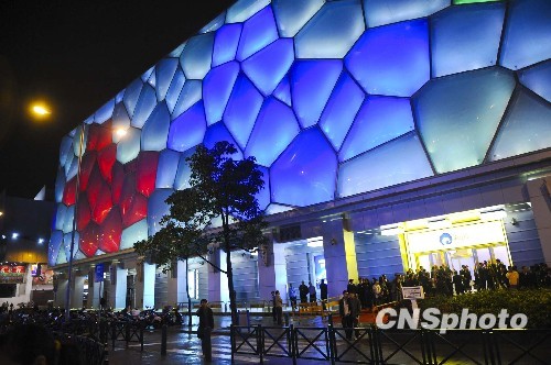 12月15日,澳门海立方娱乐场开业,门前车水马龙。“海立方”占地三万二千多平方米,外形酷似北京的水立方,LED灯具呈现出红、黄、蓝、绿紫的变幻色彩。中新社发 廖攀 摄