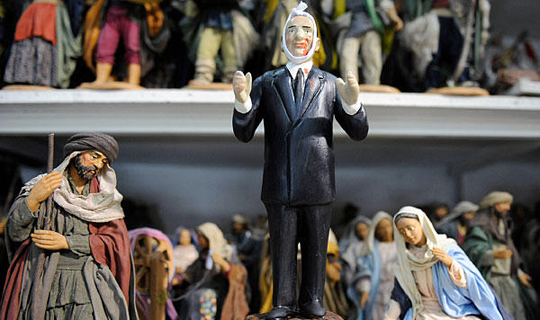 图为贝卢斯科尼遇袭后面部流血造型的玩偶出现在一家手工艺品商店。