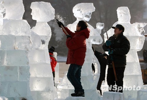 12月16日,新疆乌鲁木齐市人民广场,两位冰雕师傅正在抓紧时间雕刻一组表现新疆少数民族风情的大型冰雕作品。丝绸之路冰雪风情节将于本月底在该市举行,作为冰雪节重要组成部分的城市冰雕作品正在加紧施工中。届时,该市人民广场、南湖市民广场及城市道路交叉口将有大批造型多样的城市冰雕作品与市民见面。