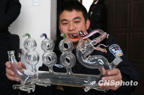 民警在展示缴获的吸毒用具。中新社发 黄金昆 摄