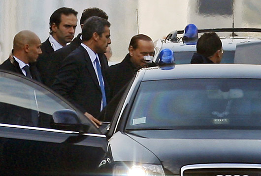 意大利总理贝卢斯科尼遭人打断鼻梁和两颗牙齿后住院四天,于当地时间17日出院。他乘轿车离开医院时,还向路人挥手致意。