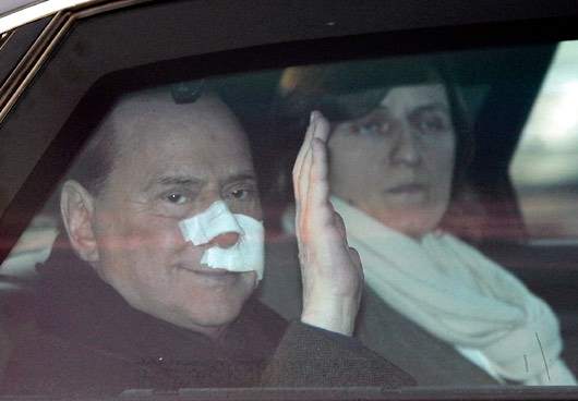 贝卢斯科尼乘轿车离开医院时,还向路人挥手致意。