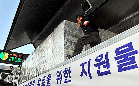 一名韩国司机在坡州检查车上装载的援助朝鲜防控甲型H1N1流感的药物。