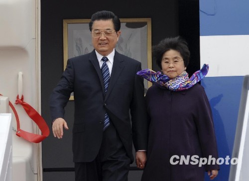 12月19日,国家主席胡锦涛乘专机抵达澳门,出席庆祝澳门回归祖国10周年活动。图为胡锦涛与夫人刘永清携手走下飞机。中新社发 廖攀 摄