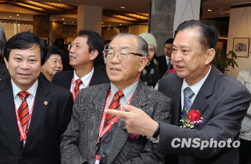 正在福建参访的以香港福建社团联会荣誉主席林广兆(右二)为荣誉团长的香港福建社团联会访问团一行在中国侨联副主席、福建省侨联主席李欲晞(右一)陪同下观看闽澳摄影作品联展。中新社发 刘可耕 摄