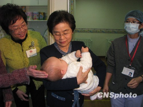 12月19日下午,国家主席胡锦涛的夫人刘永清参观澳门母亲会托儿所时,抱起一名不足一岁的婴儿。中新社发 于晶波 摄