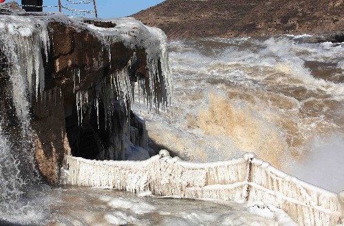 近日,黄河壶口瀑布当地的气温降到了零下10度以下,上游开始往下游流凌,壶口瀑布形成了各种各样的冰凌,加上天气非常好,彩虹不断,吸引了众多的游人来前来观看。中新社发 张旦 摄