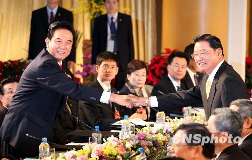 两会领导人第四次会谈二十二日上午九时在台中正式举行,海协会会长陈云林与海基会董事长江丙坤隔桌握手致意。中新社发 曾嘉 摄
