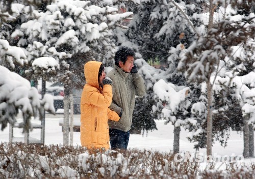 12月23日,新疆乌鲁木齐街头,一对小情侣在纷飞的大雪中出行。受西西伯利亚强冷空气东移南下影响,23日凌晨乌鲁木齐降下细雨,后逐渐转为降雪。23日清晨,整个城市已笼罩在茫茫大雪之中,积雪厚度达10厘米以上。新疆气象台已发布寒潮黄色预警信号,预计未来24小时,新疆塔城、阿勒泰、昌吉州最低气温将下降10度以上,三十里、百里风区瞬间最大风力可达11级。中新社发 刘新 摄
