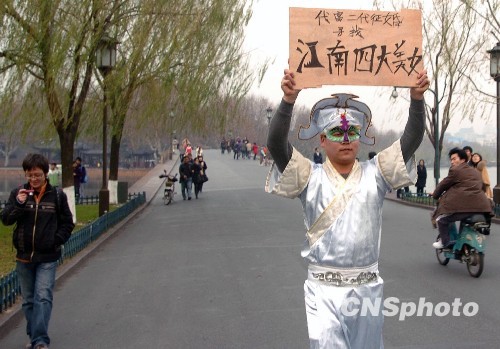 12月23日下午,在杭州西子湖畔白堤,一着古装男子,头戴着面具,举一块上书“代富二代征婚,寻找江南四大美女”木牌替人征婚,引来众人好奇的目光。当问及是哪一位富二代时,该男子拒绝透露。