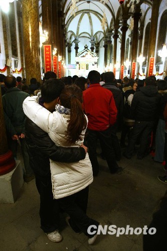 12月24日平安夜,北京王府井教堂灯火辉煌、人头攒动,图为一对情侣在教堂里欢度平安夜。中新社发 富田 摄
