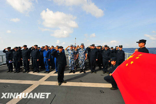 在中国海军第四批护航编队的“马鞍山”舰上,护航官兵向国旗庄严宣誓。杨志刚摄