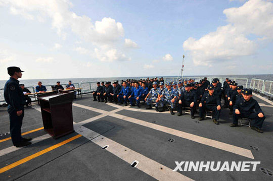 在中国海军第四批护航编队的“马鞍山”舰上,一名护航海军战士参加主题为“我自豪,我是护航人”的演讲活动。杨志刚摄
