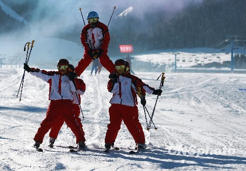 12月26日,新疆乌鲁木齐第七届丝绸之路冰雪风情在该市南郊一滑雪场隆重开幕,由五位滑雪教练表演的高难度特技滑雪,令现场观众大饱眼福。据了解,本届冰雪风情节特推出了徒步挑战赛、童年的记忆、冲关谁最棒、滑雪大赛、冰雕游园等五大主题活动。此外还开设了冰雪集体婚礼、冰雪风情摄影大赛、大众速度滑冰赛、雪地足球等丰富多彩,大众可参与的趣味性项目。中新社发 刘新 摄