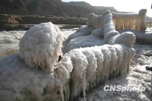 12月27日,秦晋大峡谷的黄河壶口瀑布迎来入冬以来最美的一天,连日低温使黄河壶口瀑布出现奇特美丽的冰凌景观,众多摄影人冒着严寒拍摄这一美景。中新社发 张旦 摄