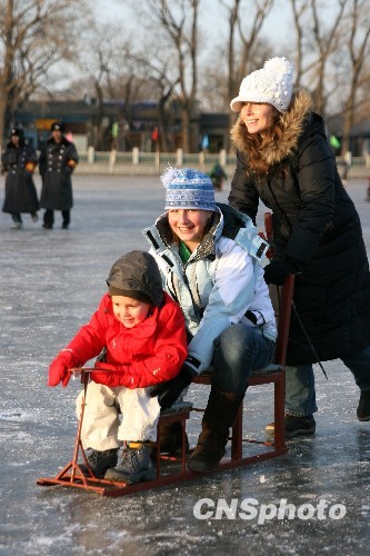 12月27日,北京什刹海冰场十分热闹,人们在这个天然冰场上滑冰车、溜冰,享受冬日运动乐趣。