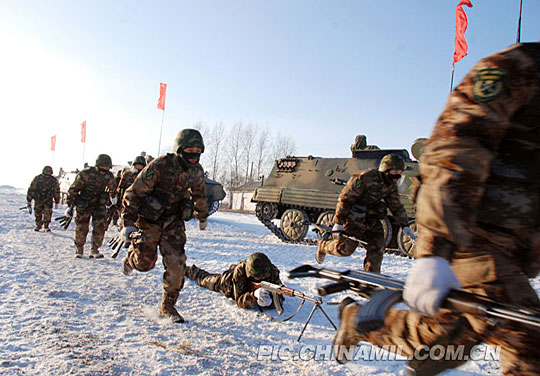 12月21日,沈阳军区某装甲团将部队拉到林海雪原上,展开快速机动、封堵布控、围歼残敌等课目的训练,通过演练有效地提高了部队在严寒条件下的作战指挥能力。图为该团展开训练时的情景。