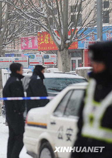 警方在事发现场等待救援人质。画面中的“水晶阁”足疗店为犯罪嫌疑人劫持人质的地点。徐家军 摄