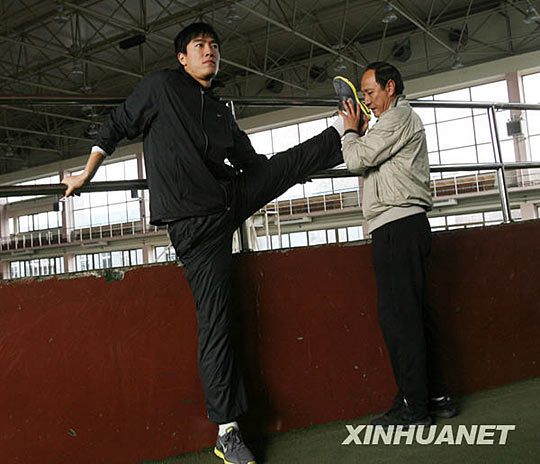 12月29日,教练孙海平(右)在公开课上指导刘翔训练。当日,在上海莘庄基地参加国家田径队冬训的刘翔等男子110米栏名将参加了首堂公开训练课。