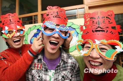 姜文涵一家三口展示由他创作的新年纸雕头饰。中新社发 陈晓根 摄