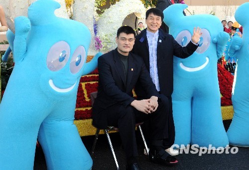 当地时间十二月三十一日,刚刚完工的上海世博会花车接受美国帕萨迪纳玫瑰花车委员会的评审,NBA中国球星姚明和香港影星成龙抵达现场为上海世博会花车助阵。