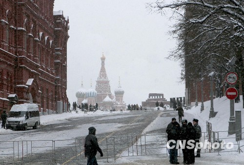 十二月三十一日,莫斯科红场入口处,警察对游客进行例行检查。莫斯科连日来遭遇强降雪天气,降雪超过二十厘米。