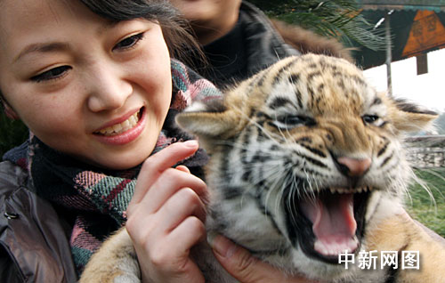 游人亲密接触小老虎。陈仕川 摄