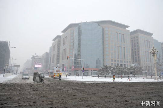 图为雪中的王府井大街。中新网记者 金硕 摄