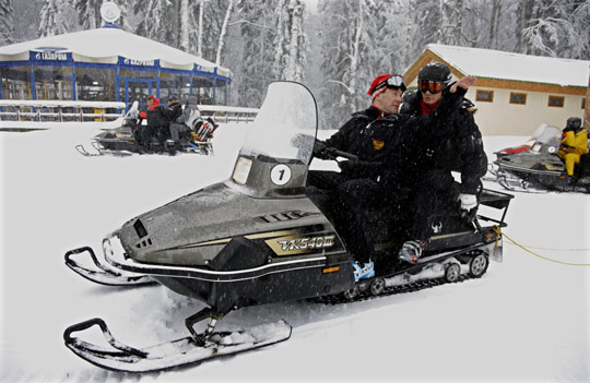 1月3日,俄罗斯总统梅德韦杰夫与总理普京在俄罗斯南部卡拉斯纳雅-波利亚纳滑雪胜地一同游玩,期间梅德韦杰夫(左)还亲自驾驶滑雪车为普京当上了“司机”。