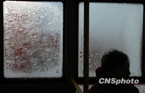 图:北京公交车窗凝结厚冰花——中新网