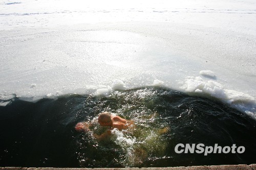 1月04日,后海黎明冬泳队的队员在进行训练。待降雪结束后,京城最低气温将迅速降至零下15到零下16摄氏度,预计将达到80年代以来的最低值。