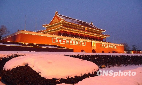 2010年1月4日傍晚,北京天安门城楼在白雪的映衬下显得更加美丽璀璨。