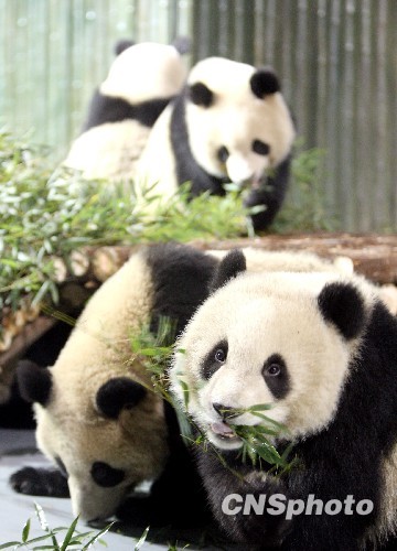 1月5日,由卧龙中国保护大熊猫研究中心精心遴选的10只“世博熊猫”经空运抵达上海,集体搬入上海动物园的新家。憨态可掬、活泼可爱的“世博熊猫”吸引了众多关注的目光。届时,海内外游客在参观上海世博会的同时还可领略中国大熊猫的风采。中新社发 汤彦俊 摄
