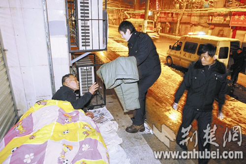 风雪一路同行。20分钟后,救助队员来到利济路人行天桥下,6位20多岁的拾荒者裹睡在2床薄被下,浑身直哆嗦。可他们都不愿到救助站,救助队员只得送上6床棉被和棉衣,并给每人发了一盒方便面。“我们尽力了”,救助队员很无奈。