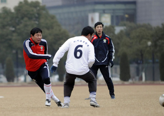 足协主席南勇披挂上阵,代表足协与杭州市民切磋球技。