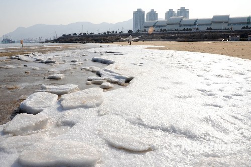 沙滩变成一片白茫茫雪地,给寒冬里的海滨增添了一道风景线,吸引不少游人前来观赏。中新社发 王春 摄