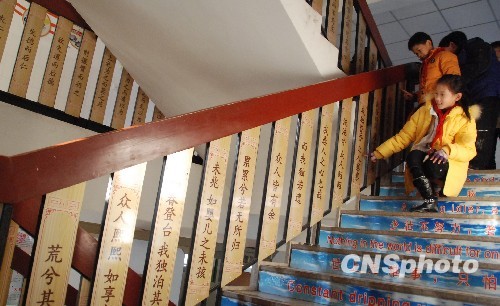 1月7日拍摄的护栏竹简书“弟子规”和“道德经”。当日,山东潍坊高新双语学校将精心制作的“弟子规”“道德经”等经典国学作品用1480块竹板雕刻,挂到了学校楼梯的护栏上。旨在通过渗透教育,让学生在不经意间养成经典诵读的习惯。 中新社发 孙树宝 摄