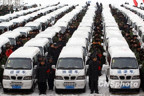1月9日,新疆乌鲁木齐市南湖广场举行社区治安巡逻、便民服务车发车仪式,第一批555辆巡逻便民服务车正式配备各社区。购车的所有费用来自384家企业的无偿捐助。中新社发 刘新 摄
