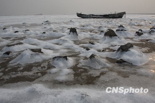 1月9日,莱州湾的渔船被厚重冰层“冻”住。受近日寒潮大风天气影响,山东沿海出现严重海水结冰现象,渤海北部沿岸出现近30年来同期最严重的海冰冰情。 中新社发 孙树宝 摄
