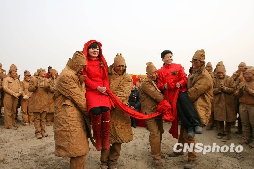 1月10日,四个"泥人”用手搭成原始花轿抬着一对新人在郑州黄河岸边别出心裁的举行婚礼。新人面向孕育了中华民族五千年文明的黄河,一拜天地,二拜高堂,之后,夫妻鞠躬对拜。在世风奢华、婚礼铺张的当下,一对新人在茫茫黄河边,让厚土为证,海誓山盟,喜结连理,以行为艺术形式表达人们保持本真、适应环境的心声。中新社发 王中举 摄