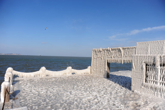 1月11日,在山东烟台市滨海路拍摄的冰凌景观。连日来,受低温天气影响,山东烟台沿岸的海水被大风刮上岸后,附着在海边铁索和建筑物上,形成美丽的冰凌景观。 初阳 摄