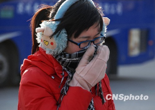 山东滨州市民冒着严寒出行。中新社发 张滨 摄