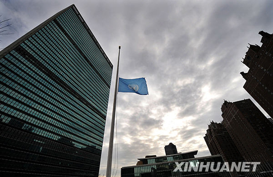 1月13日,美国纽约联合国总部大楼前的联合国会旗降半旗向海地地震中遇难者致哀。根据中国地震台网测定,海地当地时间12日下午发生里氏7.3级强烈地震,造成首都太子港大量房屋受损或倒塌。当地人士认为,地震可能造成大量人员伤亡。新华社记者 申宏 摄